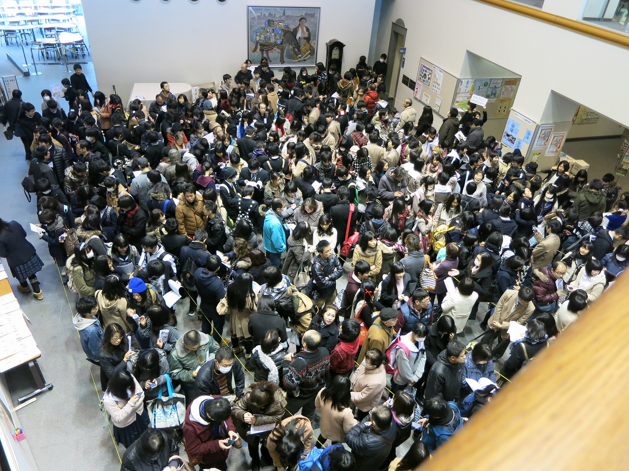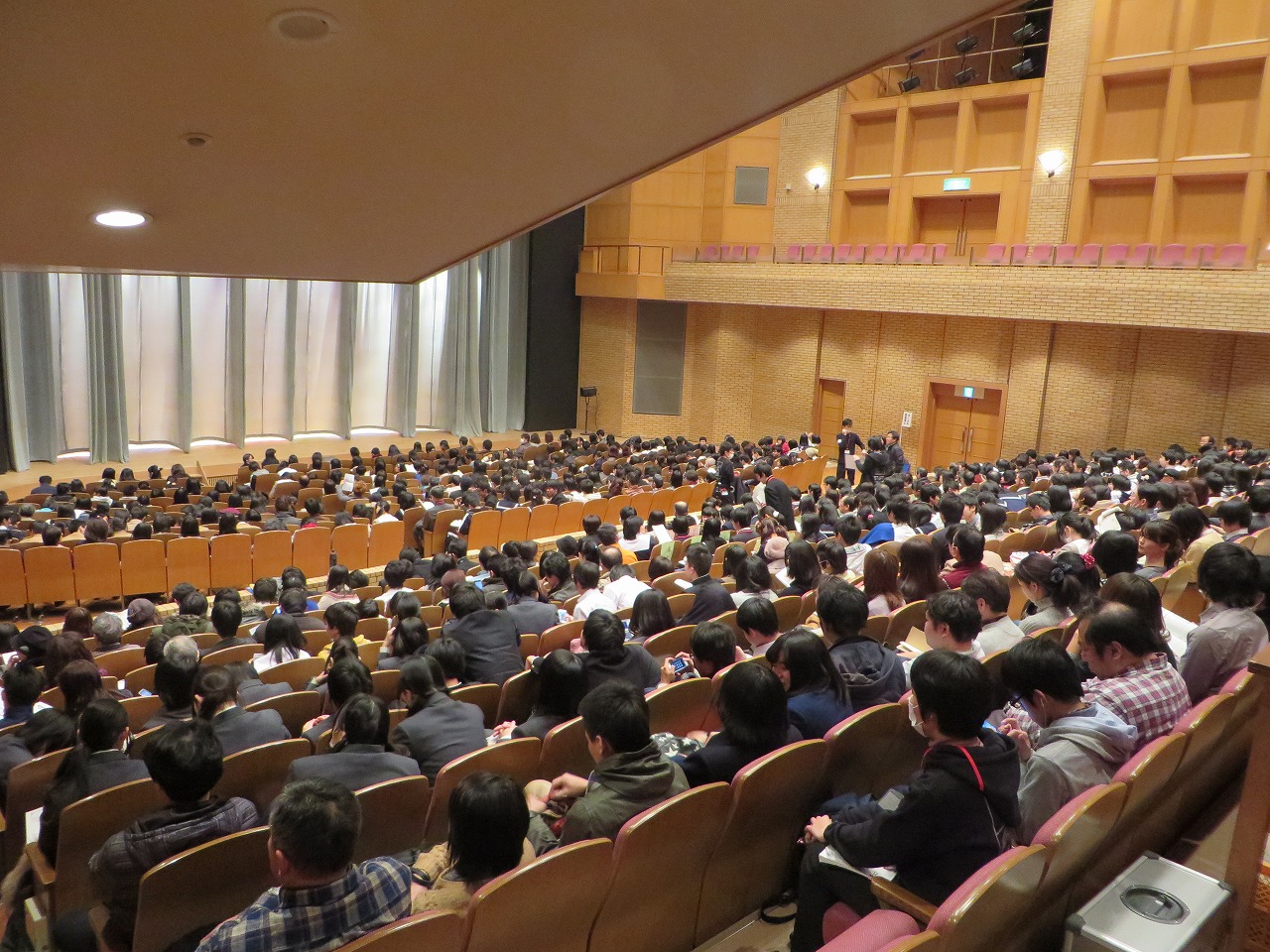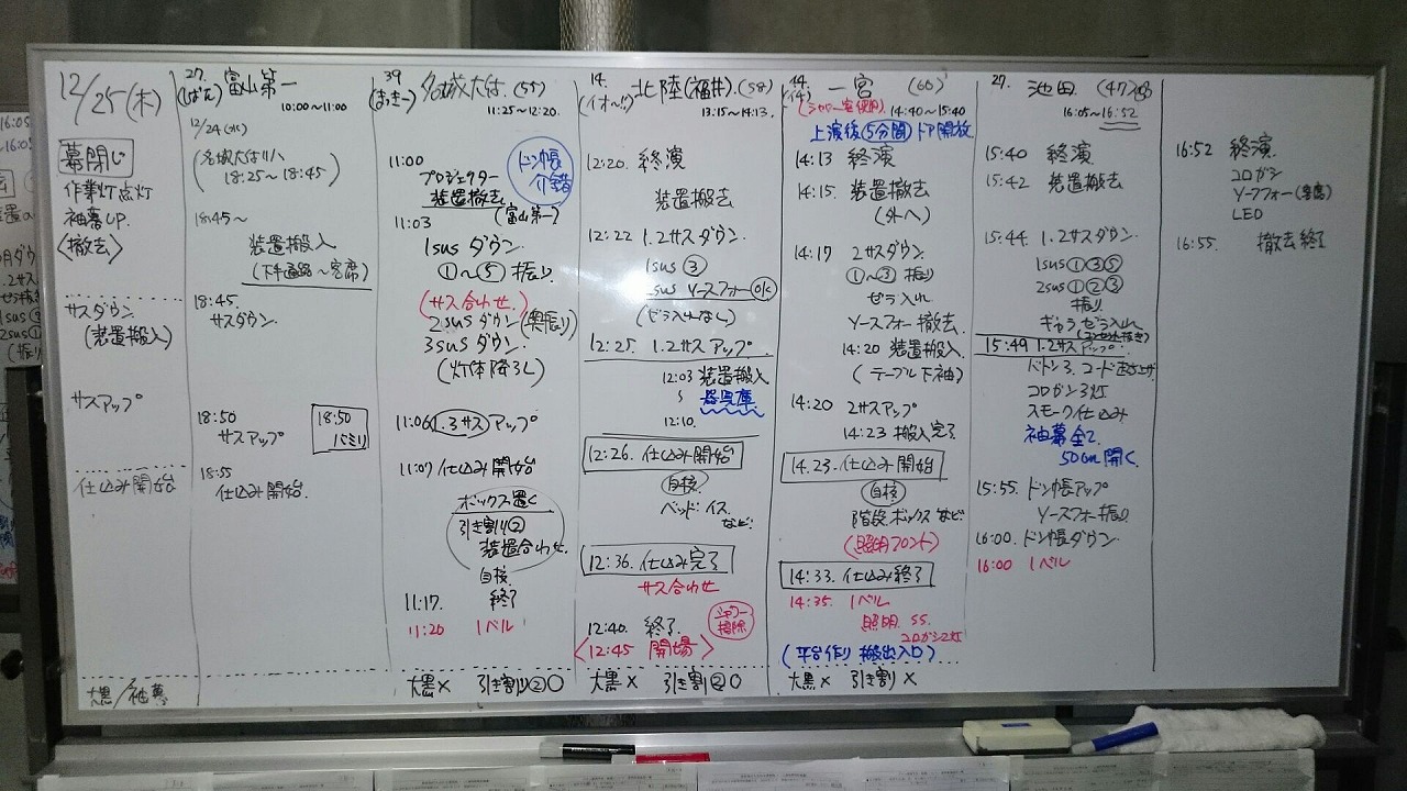 客席の様子 9時30分からの開場にもかかわらず、9時前にはホワイエが満員状態! 実行委員の「一歩!」のかけ声に合わせて、列をつめてもらったが、 それでも間に合わず、外まであふれた観客のために、開場時間を早める結果に! 受付と会場担当の 実行委員が、本当に よく頑張 って働いてくれました。 それとは別に舞台上では、さらに熾烈な戦いが行われていました。 この会館は、舞台袖にスペースがほとんどないので、 上演が終わる毎に完全に装置を入れ替えなければならない! さらにその上、照明の仕込み直しを幕間で行うので、舞台上は、まさに分刻みで動くことになる。 (例1)名城大学付属高校の仕込みの場合 11:00 富山第一高校終演 装置撤去&プロジェクター撤去(以上の作業を3分以内で!) 11:03 1サスダウン~トップサス①~⑤の振り 2サスダウン~トップサス奥振り 3サスダウン~灯体降ろし(以上をこれも3分以内で!) 11:06 1~3サスアップ 11:07 装置仕込み開始 ボックスを置く ひき割り幕装置合わせ(すべて自校で) 11:17 装置仕込み終了(10分でおそらくできるはず!) 11:18 介錯棒にてサスの振 り合わせ (さすがにこれだけは顧問教諭が行う。それでも5分以内の作業を要求される!) 11:20 1ベル(この後も、必要に応じて仕込み作業が継続!) 11:25 2ベル!