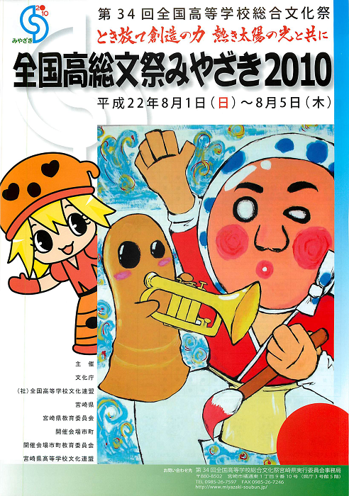 長崎総文のキャラT「メイロン」は欲しいですね。女の子の頭に龍がかぶりついたような感じが、とてもいいです。ちなみに、本校演劇部も、昨年の富山大会用に、写真のTシャツを生徒のデザインで作りました。土地のシンボル「クジラ」です。