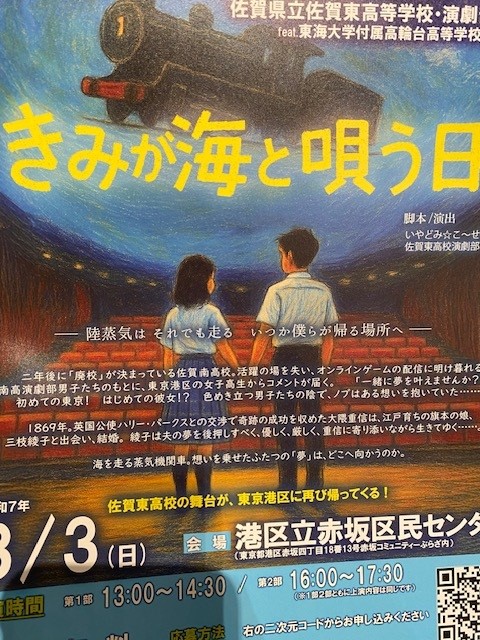 佐賀県と港区は、高輪築堤跡の発見を契機に、「お台場・高輪築堤がつなぐ佐賀県と港区との連携宣言」を行い、継続して連携事業を実施しています。その一環として昨年度より佐賀東高等学校演劇部による高輪築堤を題材とした演劇公演を上演してるのですが、今年はさらにパワーアップし港区の東海大学付属高輪台高等学校演劇部と合同して上演を行うことになりました。