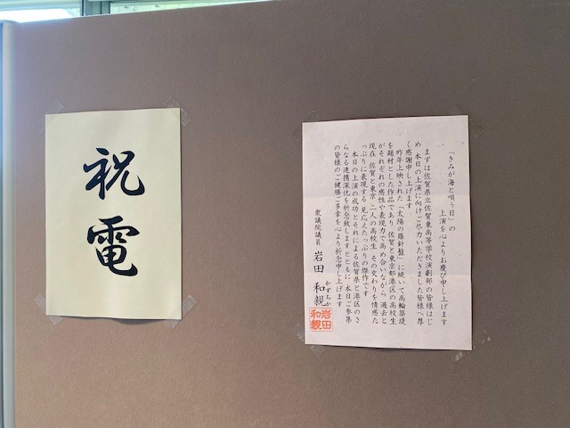 国会議員の方からの祝電の掲示や、佐賀県の副知事さんと港区区長さんによる上演前のあいさつまでありました。